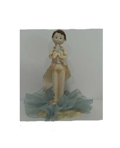 Alzatina comunione bimbo per rendere la sua torta ancora più speciale con questo bambino che prega. Situato su una base di plastica contornata dal tulle celeste. Materiale bambino: resina.