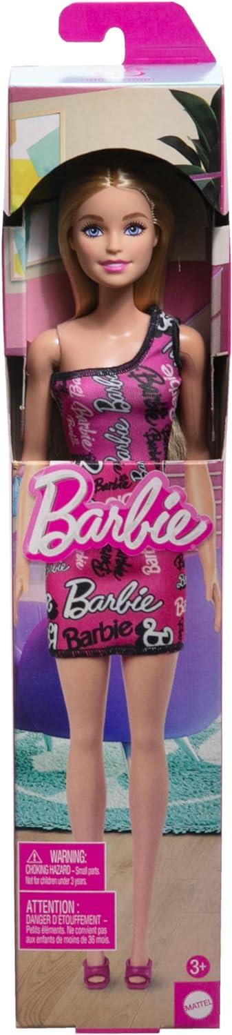 - Indossa un abito monospalla rosa rimovibile e sfoggia i loghi Barbie in bianco e nero.