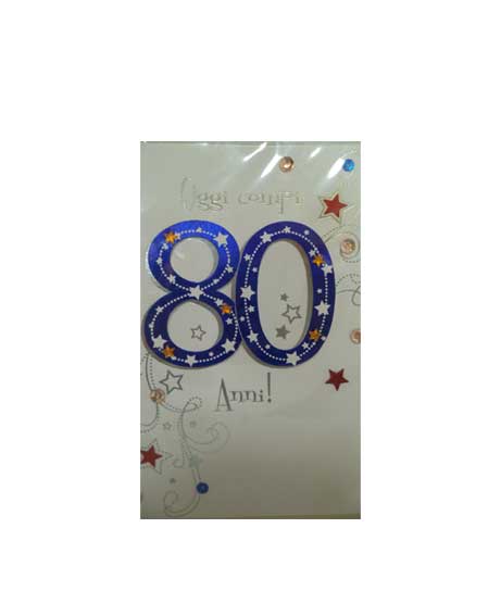Scritta all’interno: 80 anni?!? Non dirlo in giro, non ti crederà nessuno…forse nemmeno tu!!! Un mondo di Auguri: Felice Compleanno