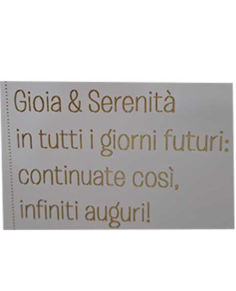 Scritta all’interno: Gioia & serenità in tutti i giorni futuri: continuate così, infiniti auguri!