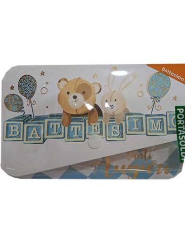 Biglietto BATTESIMO CELESTE con bottone con PALLONCINI. Completo di busta.