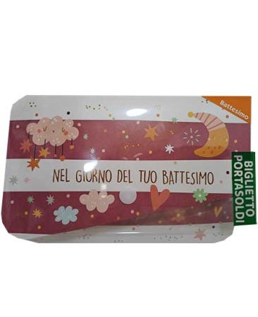 Biglietto BATTESIMO ROSA con bottone con NUVOLE. Completo di busta.