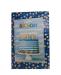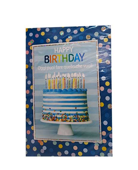 Biglietto compleanno con torta a righe celeste coimpleto di busta.