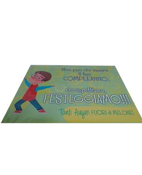 Scritta all’interno: Non può che essere il tuo compleanno: che aspettiamo, festeggiamo!!! Tanti auguri fuori di melone!