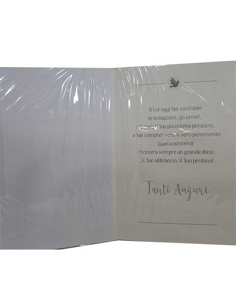 Scritta all’interno: A lui oggi hai confidato le tentazioni, gli errori, i timori, il tuo più intimo pensiero, e hai compreso che il vero pentimento ( quello sincero ) riceverà sempre un grande dono…il Suo abbraccio, il Suo perdono! Tanti Auguri