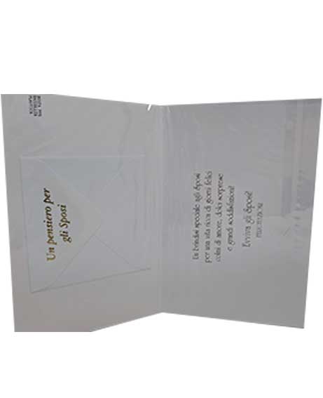 Scritta all’interno: Un pensiero per gli sposi Un brindisi speciale agli sposi per una vita ricca di giorni felici colmi di amore, dolci sorprese e grandi soddisfazioni! Evviva gli sposi! Felicitazioni