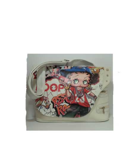 Borsa Betty Boop realizzata in ecopelle con una simpatica stampa della protagonista. Chiusura con bottone, quattro mini tasche con chiusura a zip per riporre piccoli oggetti. Tracolla regolabile.