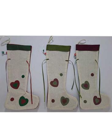 Calza porta dolci con risvolto e cuori. Fornita di nastrino per appenderla e chiuderla.