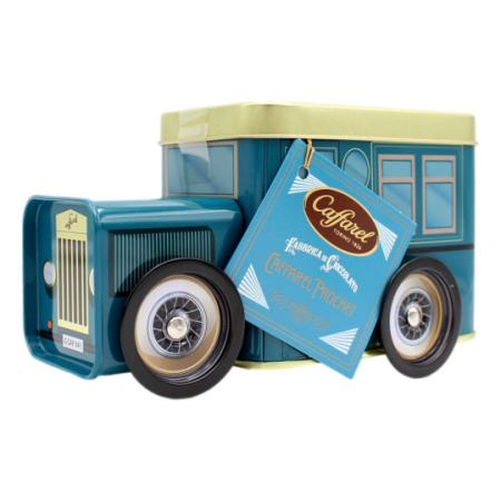 Caffarel camioncino di metallo con cioccolatini assortiti: golosa sferetta al latte, al cioccolato fondente, e cremino gianduia fondente.