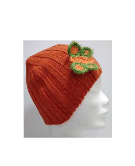 Cappello donna cuffia ma anche per ragazzine di colore arancione con una farfalla applicata.