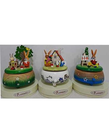 Carillon pasquale FLAMIGNI realizzato in legno con coniglietti sulla base superiore. Regalo ideale e molto gradito. All’interno della scatola ci sono 150 grammi di ovetti di cioccolato al latte ripieni di crema alla nocciola.