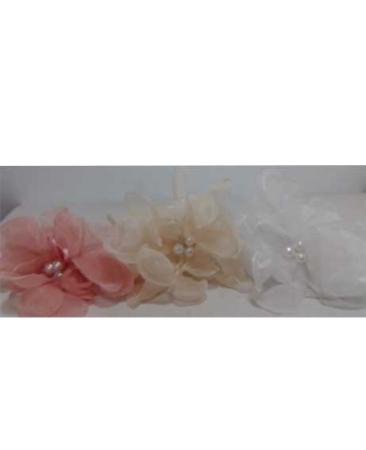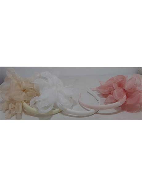 Cerchietto per capelli con fiore in organza con tantissimi petali e al centro arricchito da 3 perle, nastrini e coda di topo in tinta.