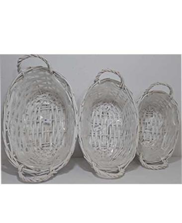 Cestino in vimini bianco disponibile in 3 dimensioni. Ideale per contenere pensierini fine festa o confettate o piccoli pensierini in occasione delle festività.