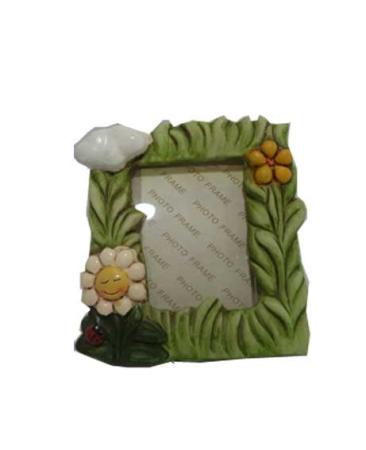 Molto originale questo portafoto tutto verde come se fosse un prato con una nuvoletta sul lato sinistro, un fiore sul lato destro e una margherita sotto a sinistra con la coccinella portafortuna sulla foglia. Fornito di scatola regalo.