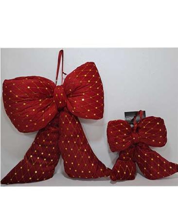 Fiocco natalizio imbottito in velluto ROSSO e decori ORO. Paillettes e impunture oro danno lucentezza ed eleganza a questo fiocco.