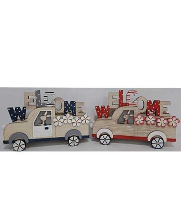 Furgoncino in legno con coniglietto e scritta WELCOME. Possibilità di accensione grazie ai LED all’interno. Funziona con 2 batterie AAA non comprese.