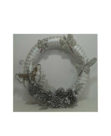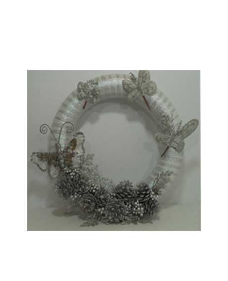 Realizzata su base in polistirolo e impreziosita con nastro argentato, pigne con foglie brillantinate e farfalle.