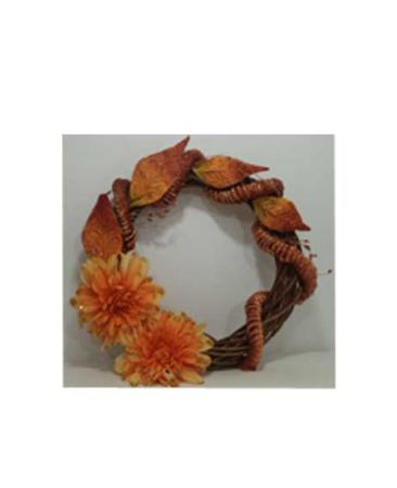 Realizzata su base in vimini e arricchita con filo, fiori e foglie con i toni che vanno dall’arancio al marrone tipici della stagione autunnale ma anche adatti al Natale.