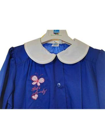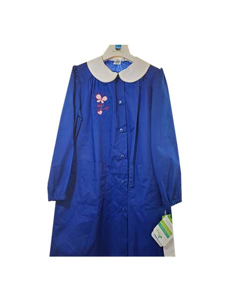 Grembiule blu per la scuola realizzato per il 65% in poliestere e il 35% in cotone con materiali certificati per garantire l’atossicità.