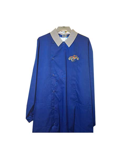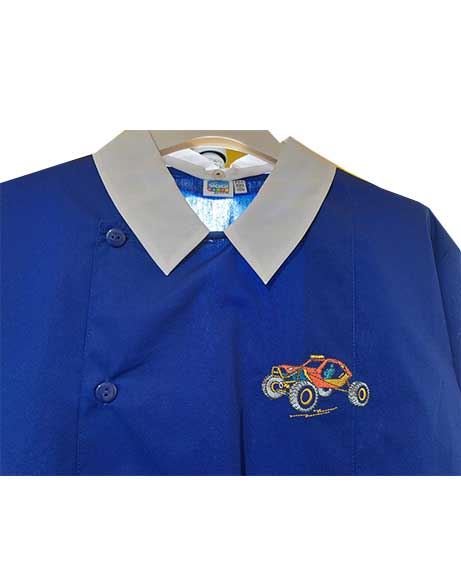 Grembiule blu per la scuola realizzato per il 65% in poliestere e il 35% in cotone con materiali certificati per garantire l’atossicità.
