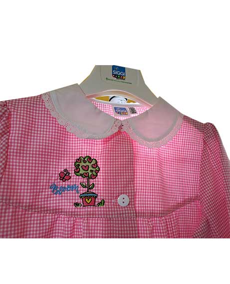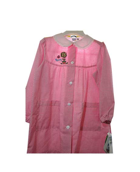 Grembiule rosa/bianco per la scuola dell’infanzia realizzato per il 65% in poliestere e il 35% in cotone con materiali certificati per garantire l’atossicità.