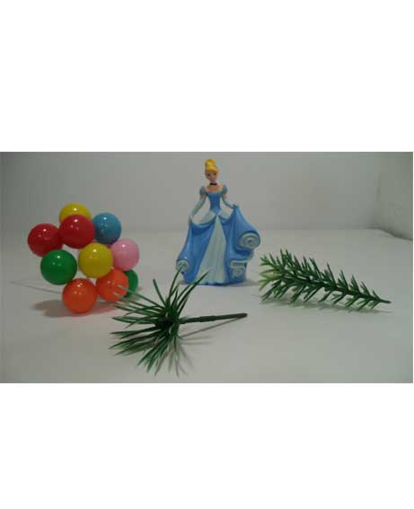 Kit cenerentola composto da Cenerentola, palloncini, cespuglio, albero.Tutti realizzati in materiale plastico.