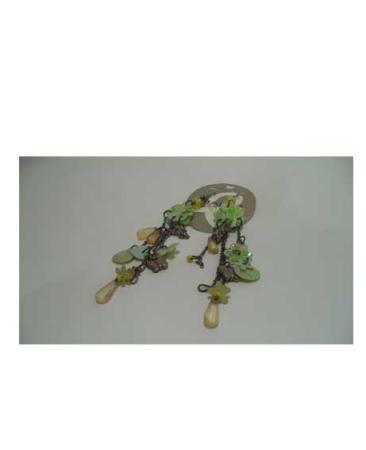 Orecchini verdi con fiore sul lato superiore, una serie di ciondoli che scendono a forma di farfalle, fiori, comchiglie e angeli.
