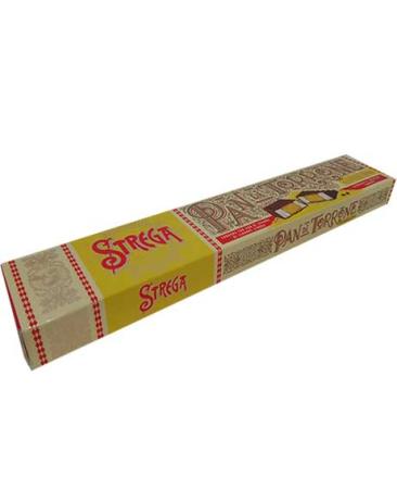 Torrone farcito al Pan di Spagna (11%) imbevuto di liquore Strega (7%) ricoperto di cioccolato fondente (48%)