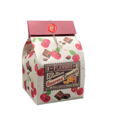 Panettone FLAMIGNI con gocce di cioccolato fondente e amarena realizzato senza uva sultanina e agrumi canditi. Prodotto dolciario da forno a lievitazione naturale.