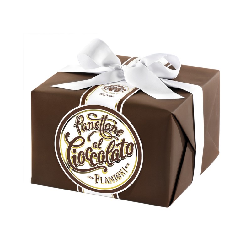 Panettone FLAMIGNI GLASSATO è un panettone artigianale con gocce di cioccolato fondente, glassato con nocciole e mandorle, senza uvetta e canditi. Confezionato in una scatola regalo marrone con fiocco bianco.