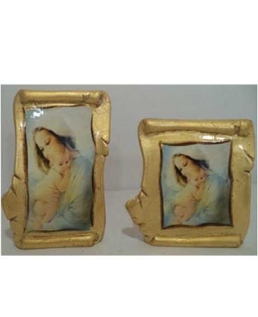 Bellissimo soprammobile ideale da regalare per qualsiasi occasione rappresentando la Madonna con Gesù in braccio racchiusi in una cornice a forma di pergamena.