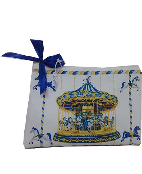 Pochette realizzata in tessuto con chiusura a zip con fantasia giostra di colore gialla-blu su sfondo bianco. Lateralmente sono disegnati anche dei cavalli a dondolo.