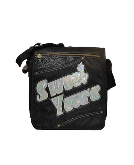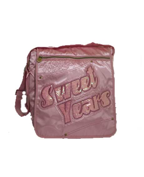 Postina Sweet Years verticale realizzata in tessuto poliestere con chiusura con velcro. Sulla pattina davanti c’è una zip dove poter riporre oggetti. La scritta è decorata con paillettes. Tracolla regolabile.