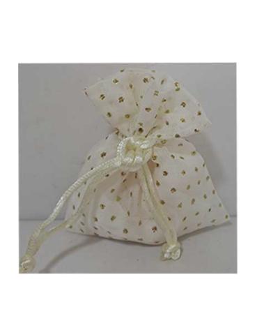 Sacchetto portaconfetti bianco a pois dorati brillantinati realizzato in tessuto. Si chiude tirando i nastrini laterali.