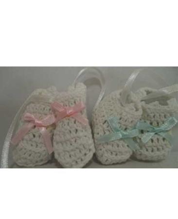 Simpatica la coppia di scarpette all’uncinetto da utilizzare vicino a un sacchetto o una scatolina portaconfetti per nascite e battesimi. Fornite di nastrino per legarle o si possono anche incollare.