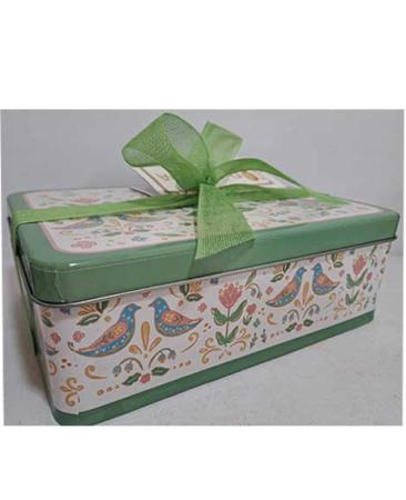 Scatola in latta rivestita con carta adesiva fantasia uccelli.