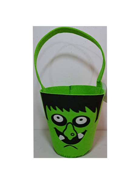 Secchiello HALLOWEEN in feltro verde con manico. Ideale da riempire con dolcetti.