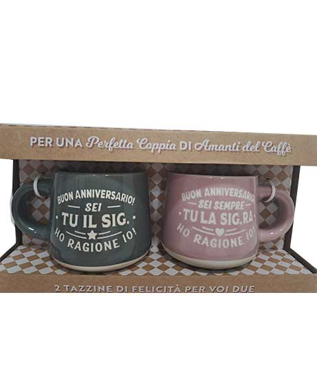 Set 2 tazzine con frase: BUON ANNIVERSARIO SEI TU IL SIG. HO RAGIONE IO – BUON ANNIVERSARIO SEI SEMPRE TU LA SIG.RA HO RAGIONE IO