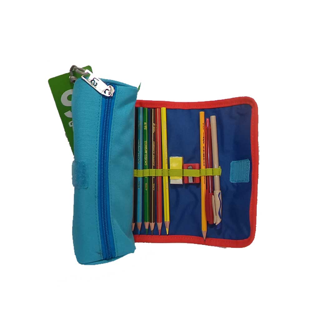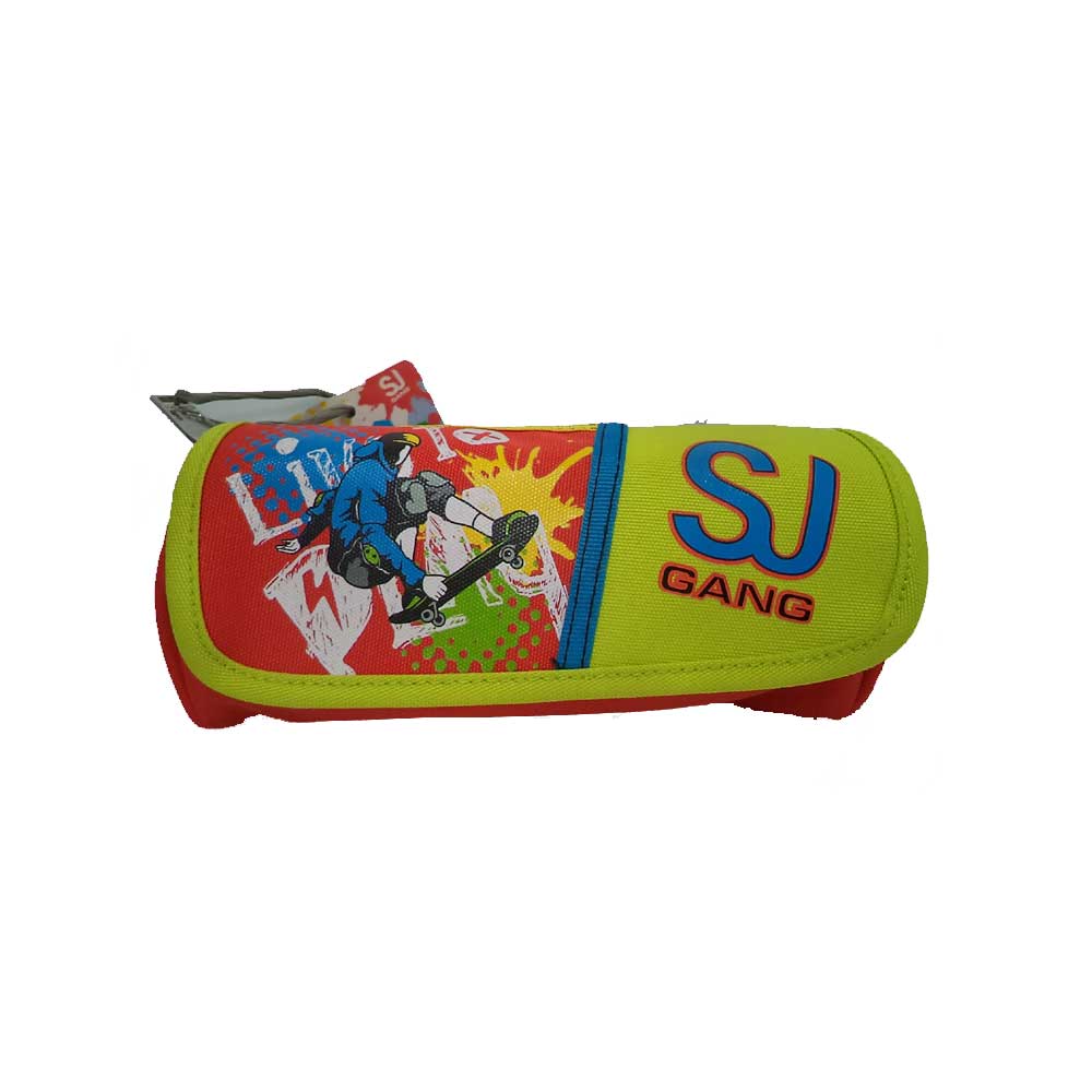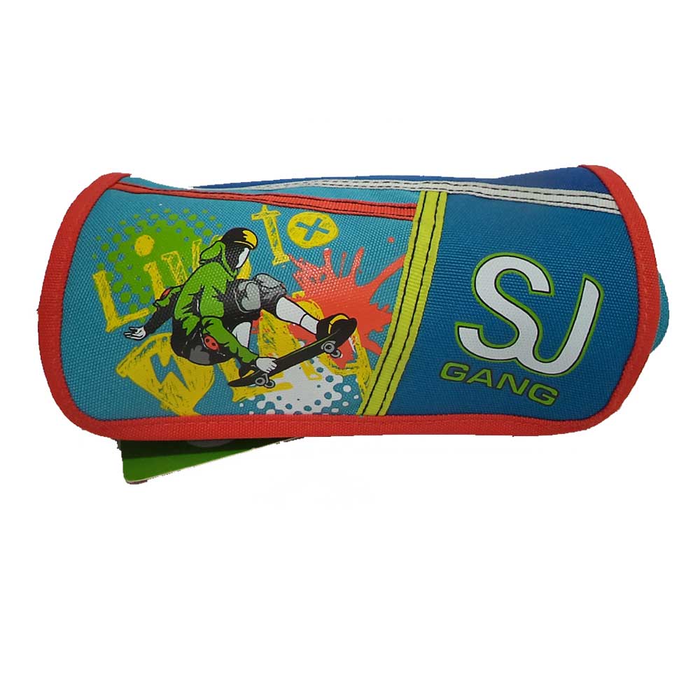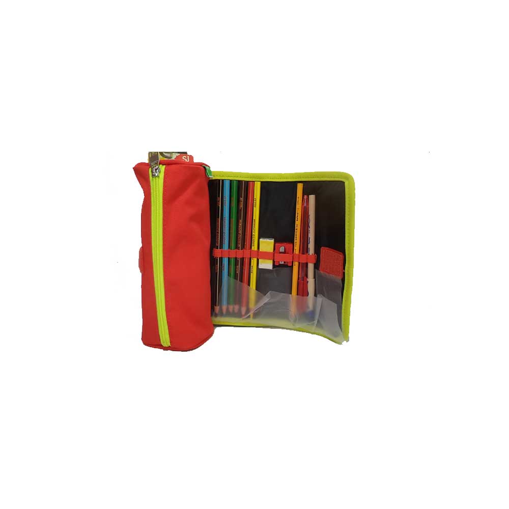 Tombolino Sj Gang attrezzato in tessuto poliestere. Nel tombolino con chiusura a zip puoi mettere tutto ciò che vuoi mentre nella pattina che si apre ci sono i colori primari, la matita, la penna, la gomma e il temperino.