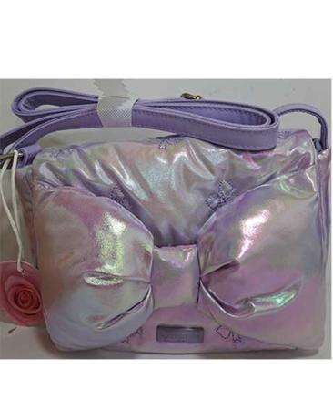 Tracollina CAMOMILLA lilla con fiocco realizzato in tessuto poliestere iridescente. Chiusura con bottone. Tracolla regolabile.