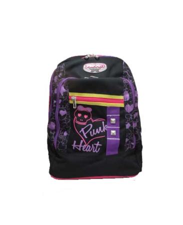 Zaino Seven tondo realizzato in tessuto poliestere, schienale rinforzato, spallacci rinforzati e rivestiti di tessuto, base rigida. Composto da due scomparti per poter separare libri da quaderni, una tasca sul davanti per riporre la merenda e una più piccola per riporre piccoli oggetti. Tutti gli scomparti sono chiudibili con zip.